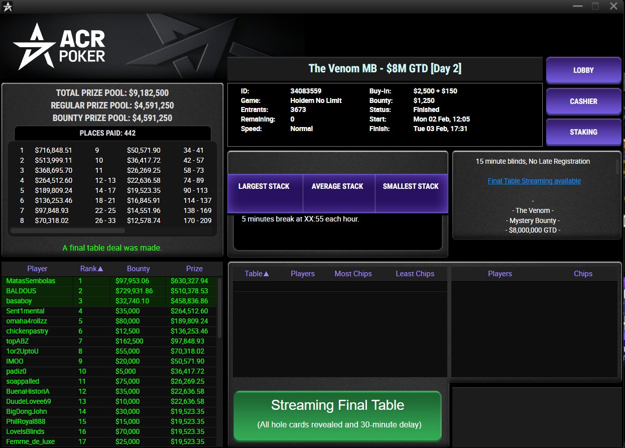 Το event, που αποτελούσε μέρος της τελευταίας σειράς Venom του ACR Poker, είχε κόστος συμμετοχής $2.500 και ολοκληρώθηκε με prize pool άνω των $9.100.000, το οποίο μοιράστηκε ισόποσα μεταξύ των bounty επάθλων και των κανονικών επάθλων.