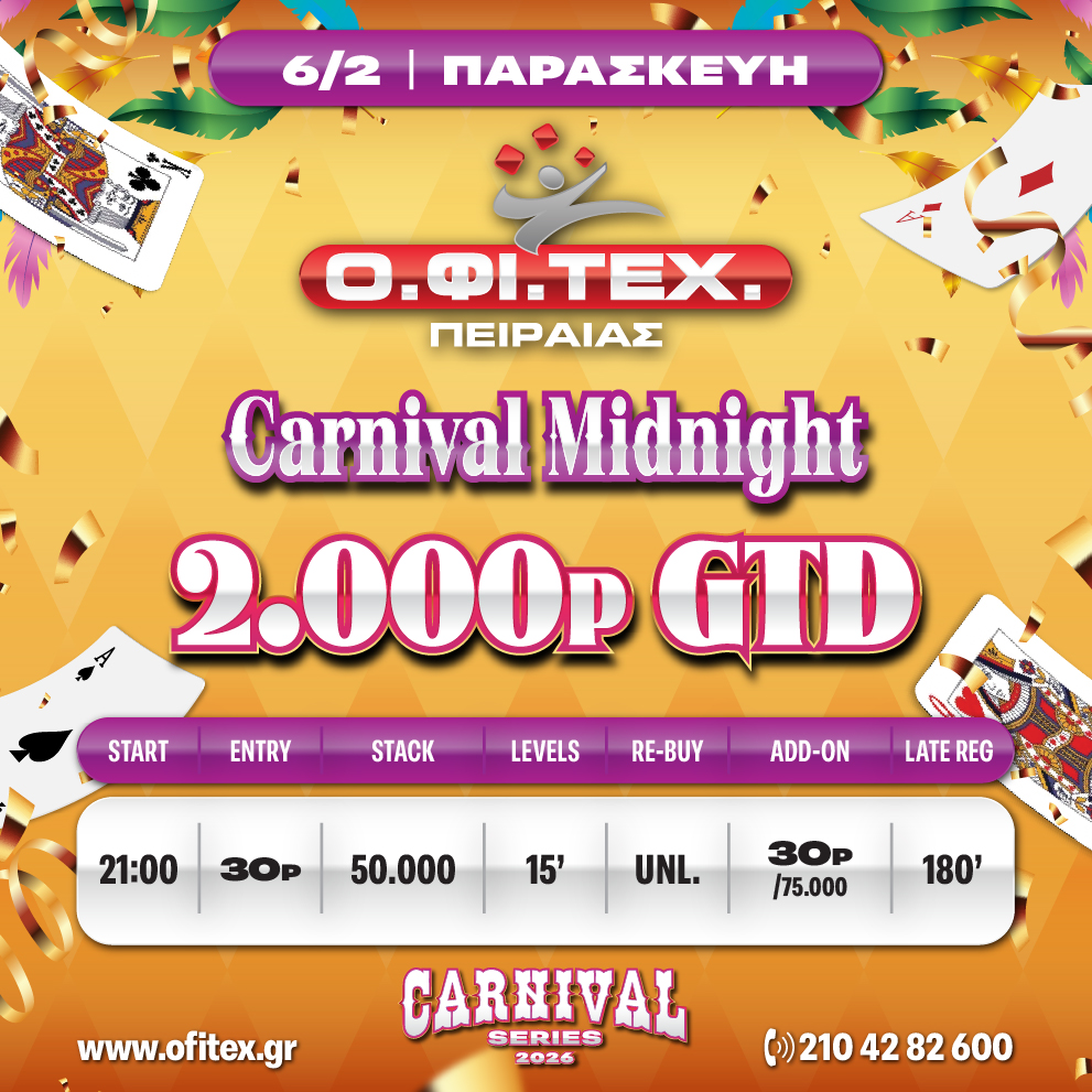 τo freeroll road to Midnight και το Carnival Midnight (2.000p gtd) στον Πειραιά