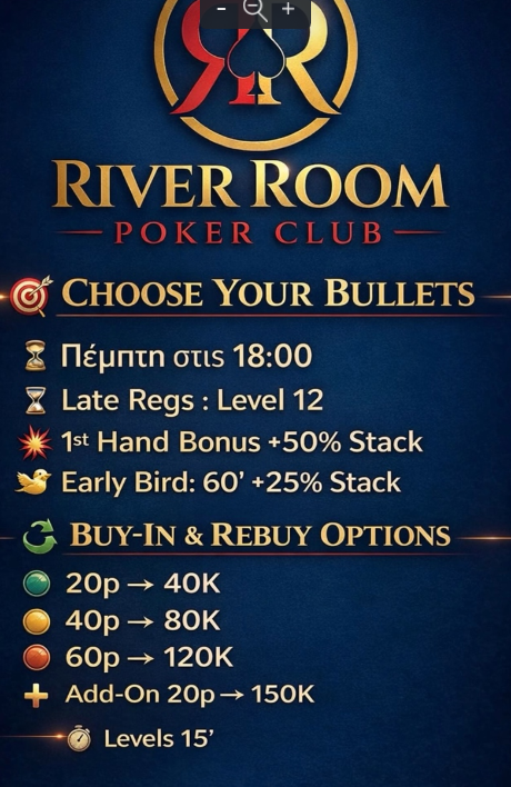 Το αγαπημένο εβδομαδιαίο τουρνουά των παικτών (Choose Your Bullets) επιστρέφει απόψε στο River room poker club.