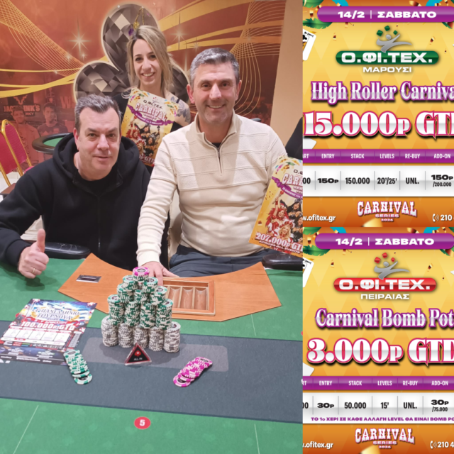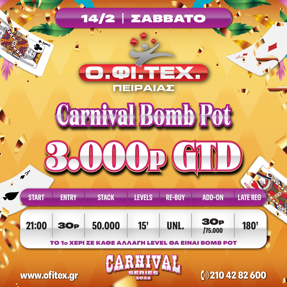 το freeroll και το Carnival Bomb Pot (3.000p gtd) στον Πειραιά