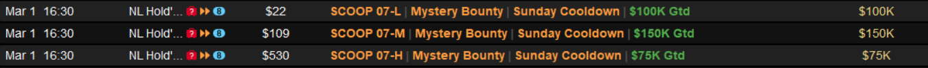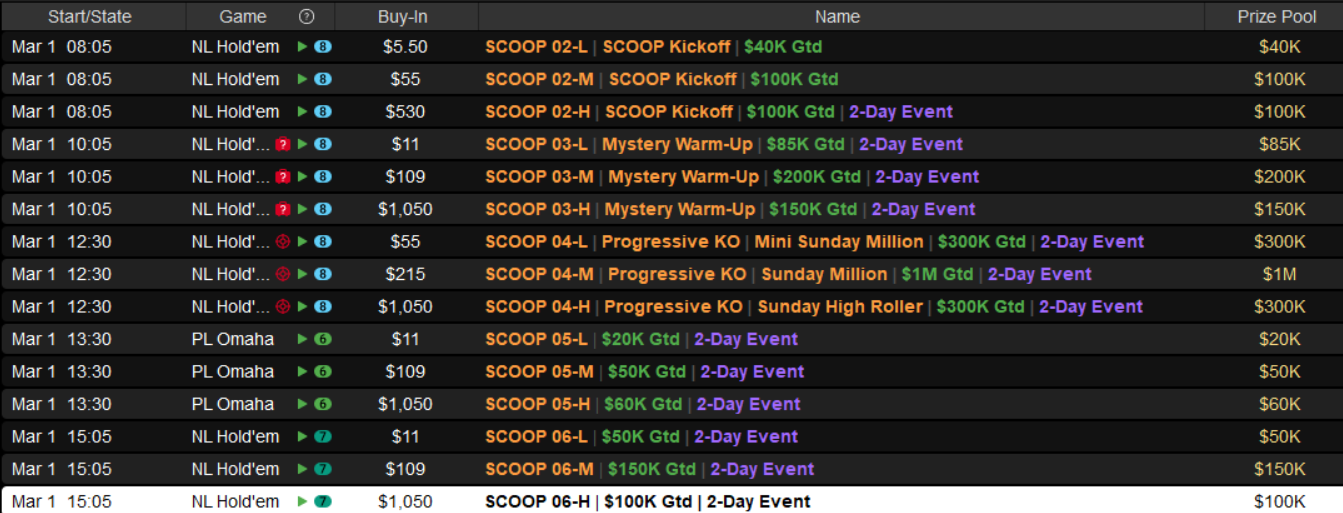 Στο πρόγραμμα του SCOOP περιλαμβάνονται 136 events. Για κάθε event υπάρχουν διαφορετικά επίπεδα buy-in, με αποτέλεσμα να διεξαχθούν συνολικά 400 τουρνουά πόκερ. Το No-Limit Hold’em κυριαρχεί στο πρόγραμμα, αλλά υπάρχουν επίσης Omaha σε διάφορες παραλλαγές, Draw, Stud και Mixed Games.