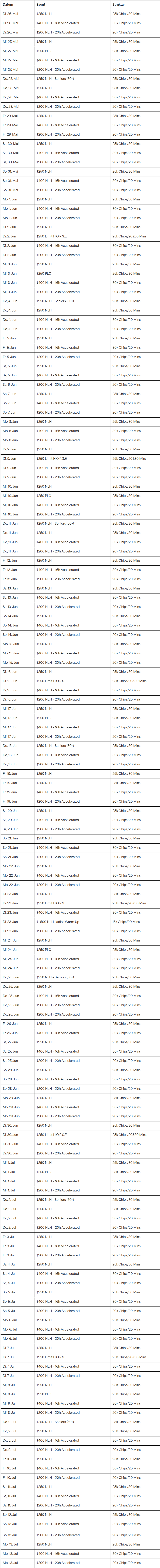 Το No-Limit Hold’em κυριαρχεί στο πρόγραμμα. Επιπλέον, υπάρχουν επτά events Pot-Limit Omaha καθώς και έξι τουρνουά HORSE. Ανάλογα με το event, οι παίκτες λαμβάνουν 20.000 έως 30.000 μάρκες. Τα blind levels κυμαίνονται μεταξύ 20 και 30 λεπτών.