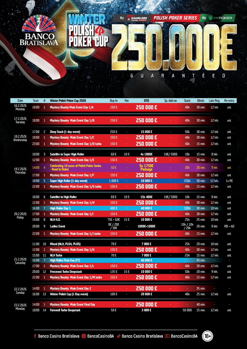 Τo Winter Polish Poker Cup ξεκίνησε στο καζίνο Banco και το €150 Mystery Bounty πρόκειται να μοιράσει τουλάχιστον 250.000 ευρώ!