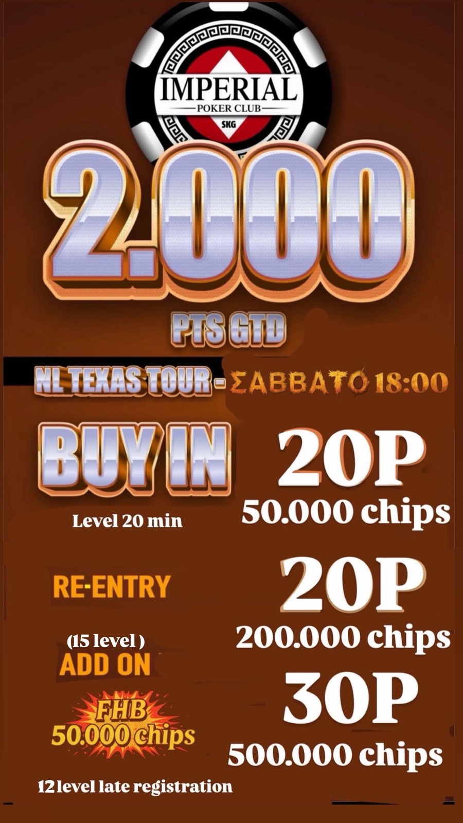 Δικαίωμα για καθυστερημένες εγγραφές στα πρώτα 12 levels και απεριόριστα rebuys (20p – 200.000) στα πρώτα 15 levels