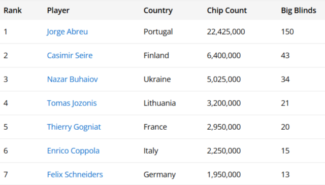 Ο Jorge Abreu κυριάρχησε καθ’ όλη τη διάρκεια της ημέρας, χτίζοντας ένα τεράστιο stack ύψους 22.425.000 μαρκών, που τον καθιστά με διαφορά chip leader ενόψει του τελικού τραπεζιού.