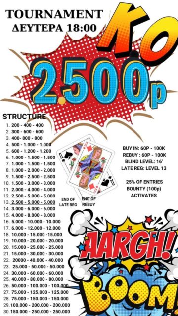 Στους 60p η είσοδος/rebuy και μόλις απομείνει το 25% των συμμετοχών ενεργοποιούνται και τα bounties των 100p ανά παίκτη!
