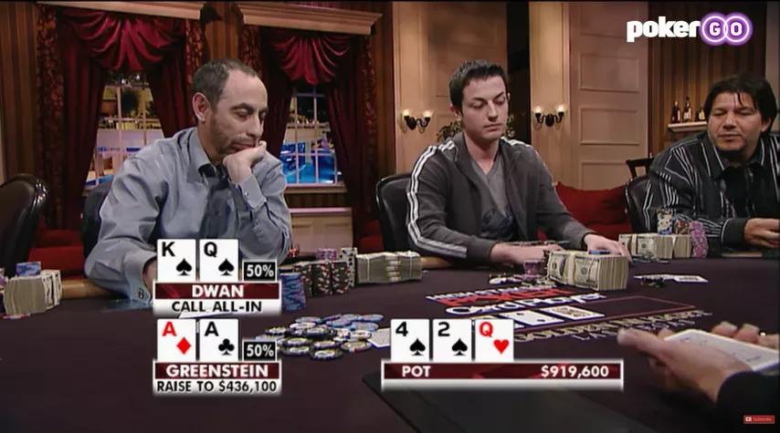 Περίμενε, περίμενε. Ο Tom έχει , ο Barry έχει . Το flop είναι με δύο μπαστούνια. Ο Tom έχει top pair και draw για flush. Μπαίνουν all-in και αμέσως ξεκινά συζήτηση για το πόσες φορές θέλουν να “τρέξουν” το board.