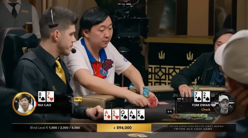 Στο river έρχεται . Ο Tom κάνει check. Ο Rui πηγαίνει all-in. Ο Tom κάνει fold.