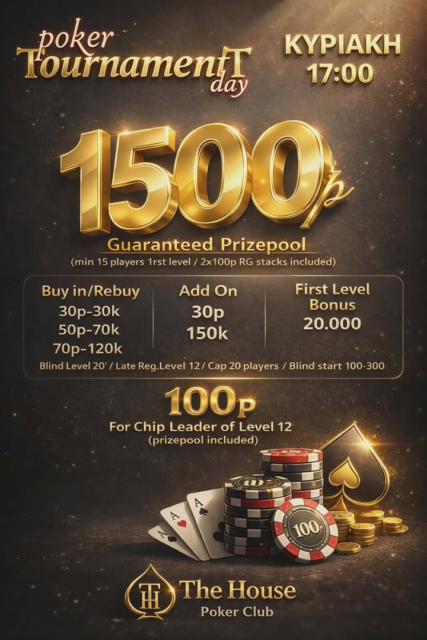Το “Τhe House Poker Club” σας περιμένει αυτή την Κυριακή στις 17:00 για ένα τουρνουά με 1.500p gtd!