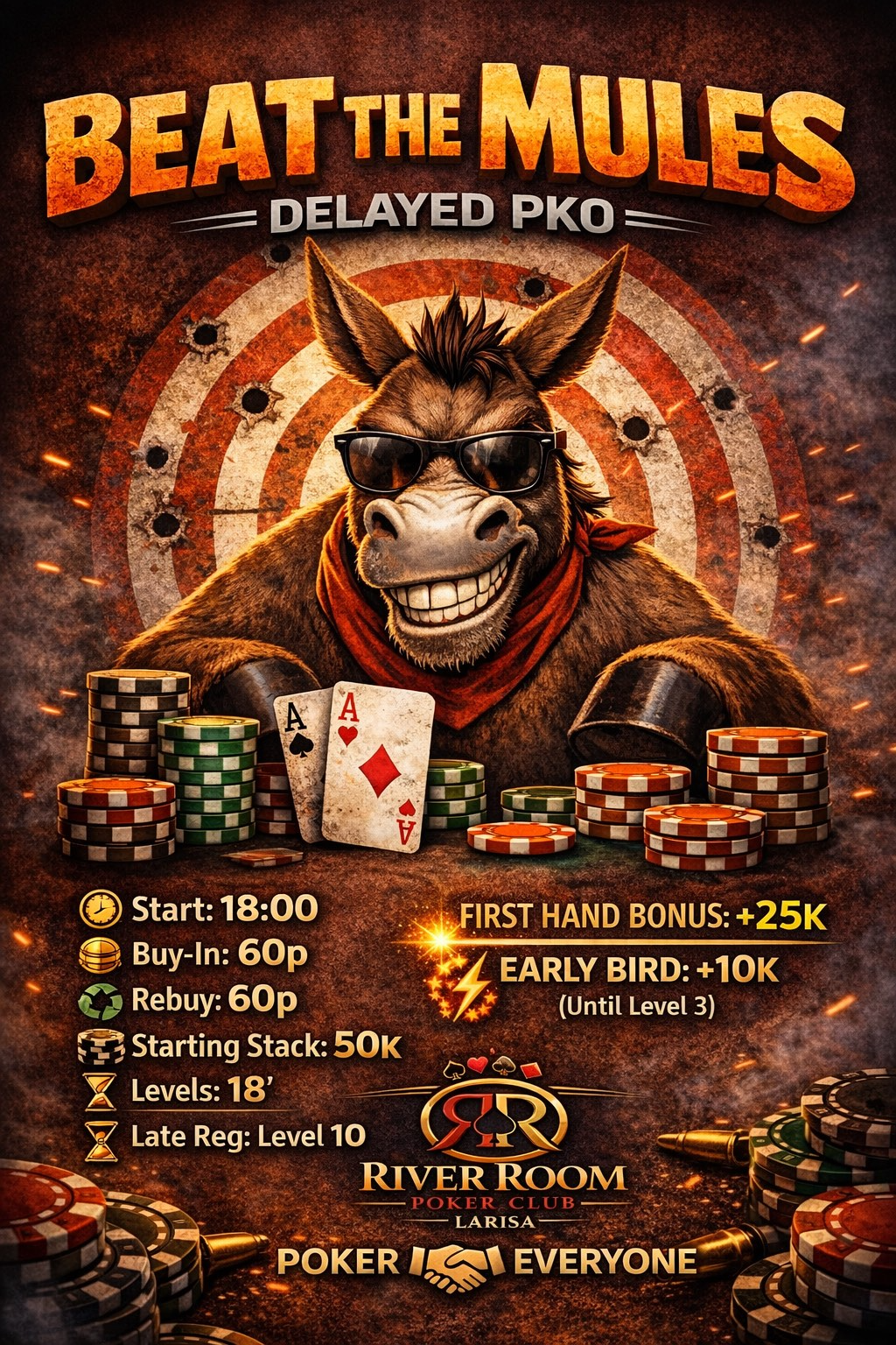 Το 60p Beat the Mules (Delayed PKO) επιστρέφει μετά από καιρό στο River room poker club της Λάρισας.