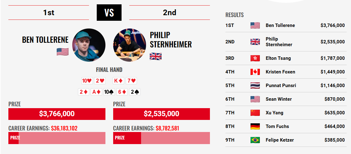 Με αυτή τη νίκη, ο 39χρονος Tollerene ισοφάρισε τον καλό του φίλο Jason Koon, αποκτώντας το δεύτερο ρολόι Jacob & Co, το οποίο απονέμεται αποκλειστικά στους νικητές των Main Events της σειράς Triton Poker. Ο Koon έχει κατακτήσει ένα Main Event στο hold’em και ένα στο short deck, ενώ ο Tollerene προσθέτει αυτόν τον τίτλο στο No Limit Hold’em δίπλα σ” αυτόν του PLO που είχε κερδίσει στο Μαυροβούνιο πέρυσι.