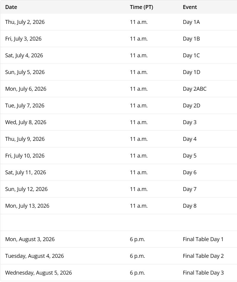 Ο τελικός θα μεταδοθεί ζωντανά σε τρεις βραδιές, από 3 έως 5 Αυγούστου (21:00 – 00:00 EST). Πρόκειται για μία ημέρα περισσότερη σε σχέση με το WSOP Main Event του 2025, το οποίο ολοκληρώθηκε σε δύο ημέρες και κατέκτησε ο Michael Mizrachi, κερδίζοντας $10.000.000!