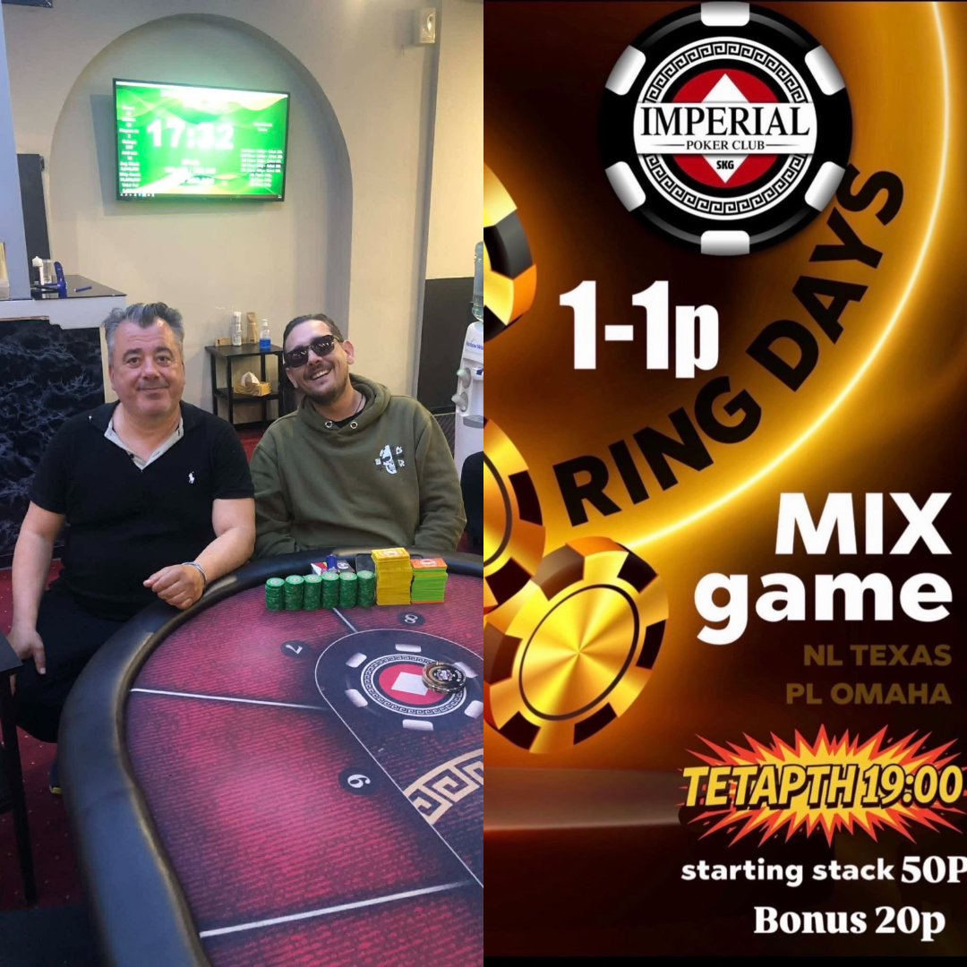Mέρα αφιερωμένη στα ring games σήμερα με 1p/1p mix games και bonus 20p από τις 19:00.