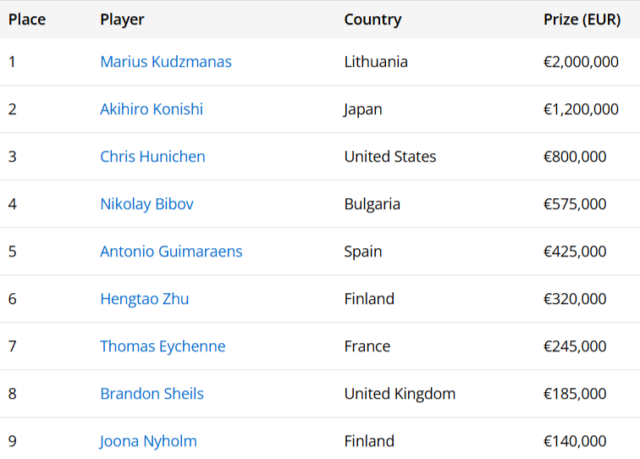 Στο τελευταίο χέρι, όλες οι μάρκες μπήκαν στο flop 7-5-4. Ο Konishi ήταν μπροστά με ρηγάδες, όμως το 7-6 του Kudzmanas βελτιώθηκε σε trips στο turn και κράτησε μέχρι το river, ολοκληρώνοντας το ιστορικό τουρνουά.