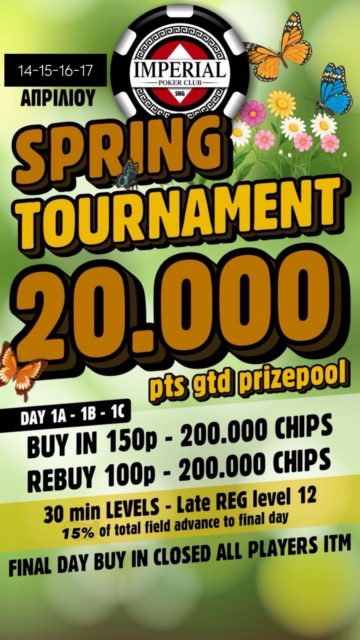 Το Imperial poker club εύχεται σε όλα τα μέλη της ποκερικής κοινότητας χρόνια πολλά με υγεία και… τύχη κι επιστρέφει δυναμικά από Δευτέρα με ring games και την Τρίτη με το μεγάλο ανοιξιάτικο event (20.000p gtd) που πρόκειται να… σπάσει τα κοντέρ!