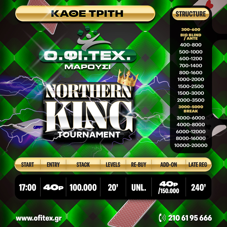 Καθυστερημένες εγγραφές και δικαίωμα για απεριόριστα rebuys (10p – 20.000) τα πρώτα 180 λεπτά
