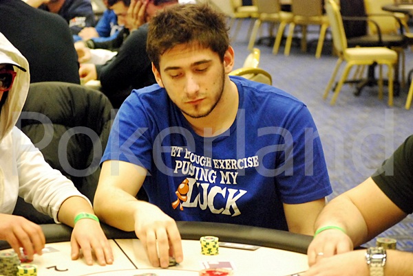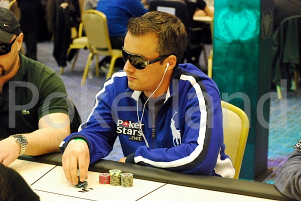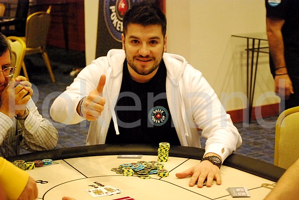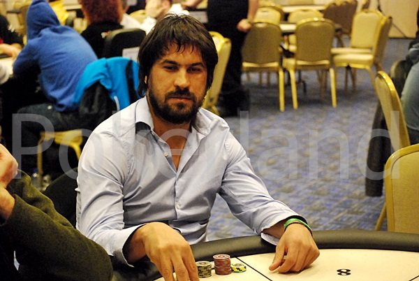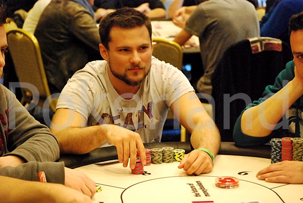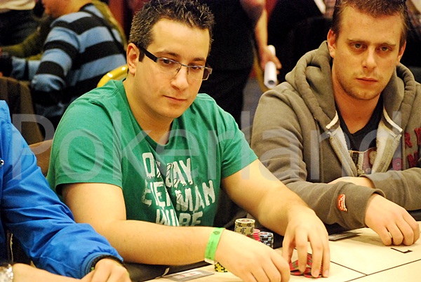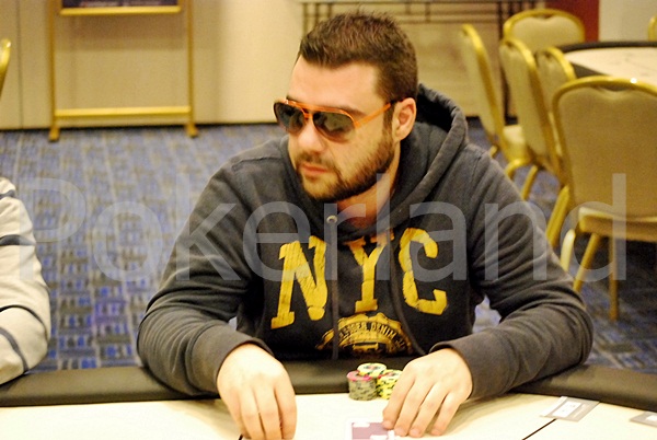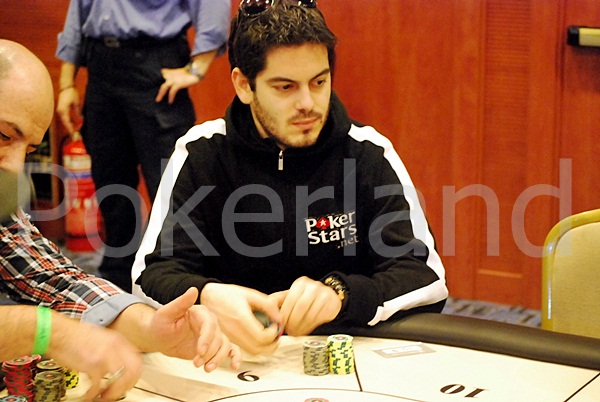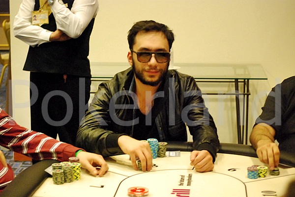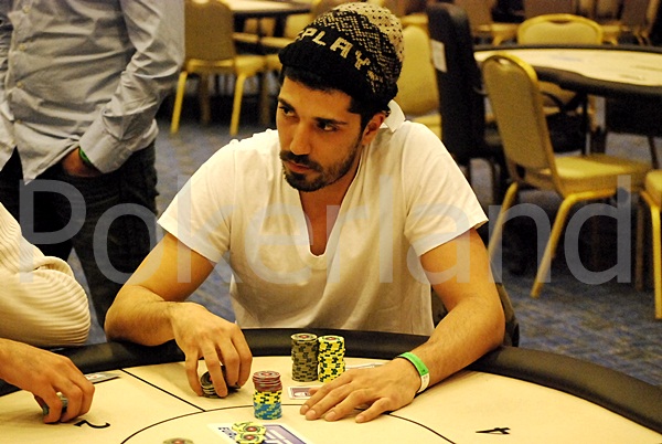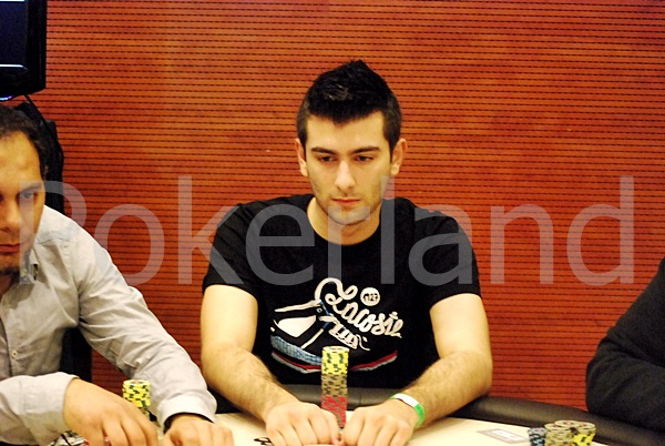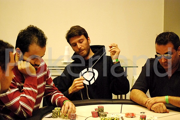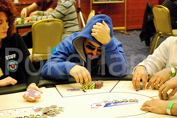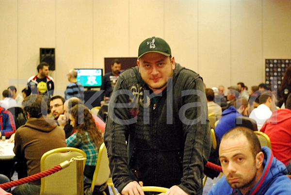 Blinds 2.000/4.000 ante 300: Ο “dimelias” (φώτ0) ο οποίος σε κάποια στιγμή είχε 15.000 μάρκες αυτή τη στιγμή είναι με 120.000. Στο χέρι που ανέβασε το στακ του κατά μεγάλο ποσοστό βρέθηκε σε τριπλό all in preflop με Α-10 και κατάφερε να σπάσει Q-Q και 9-9.