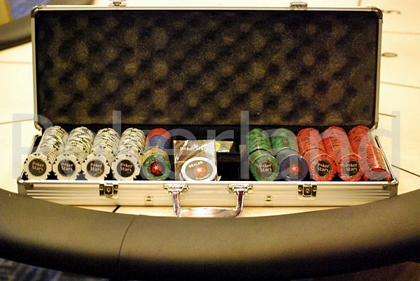 Blinds 3.000/6.000 ante 500: Το παιχνίδι όπως είναι φυσικό έχει «σφίξει» αρκετά. Στην φώτο βλέπετε το σετ μαρκών που θα πάρει ο παίκτης που θα είναι το bubble του Greek Poker Cup Main Event.