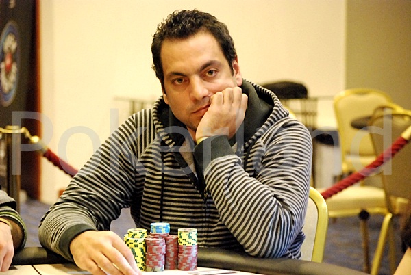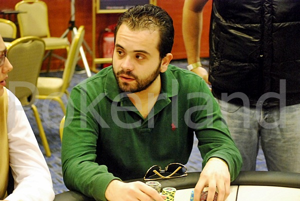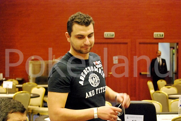 Blinds 12.000/24.000 ante 200: Διπλασιασμός για τον Γιώργο Κατσούρη (φώτο) όταν μετά από raise του dimelias από το button μπήκε all in από το big blind για 270.000 μάρκες με Α-Q με τον Δημήτρη να κάνει call με 10-10.