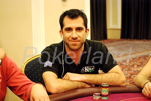 Στη φωτό ο Δημήτρης Φαρμακούλης (φωτό πάνω), chip leader αυτή τη στιγμή, με 67.000 μάρκες, σε παρτίδα που με σετ Άσσους σε board A-K-3-10-4 o αντίπαλος του πλήρωσε τα πονταρίσματα του και στα τρία streets, 14.000 μάλιστα στο river. Δεν είδαμε όμως τα φύλλα του, αφού τα πέταξε στο muck…