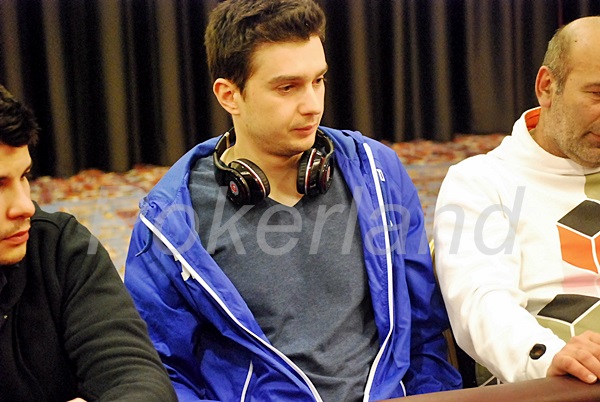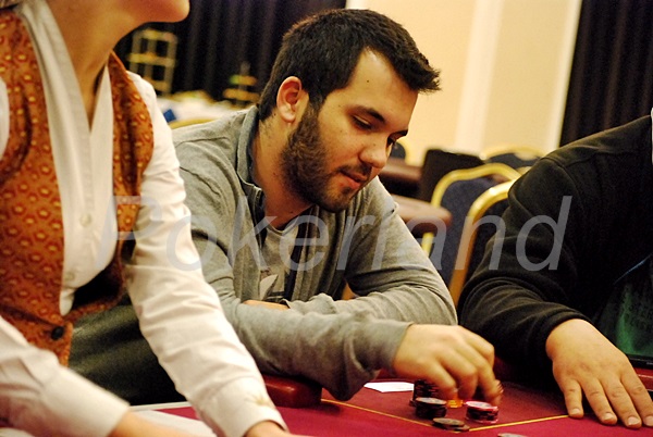 Day 1, 300/600, ante 50: Aποκλεισμός του Κορνήλιου Τσαλώνη (φωτό), ως εξής: Mini raise από το Button, 3-bet το big blind (Ρογκάκης Γιώργος), all in ο Κορνήλιος (13.500) με