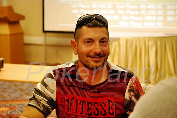 Ήδη είχαμε τον πρώτο αποκλεισμό, ο Θανάσης Καραγκιόζης (φωτό πάνω) σε φλοπ Κ-J-8 έκανε call σε 3-bet all in κρατώντας 10άρια, ο αντίπαλος του (παίκτης από τη Γευγελή) είχε Α-Κ και δέχθηκε με ευχαρίστηση αυτό το… δώρο, στο πρώτο level.