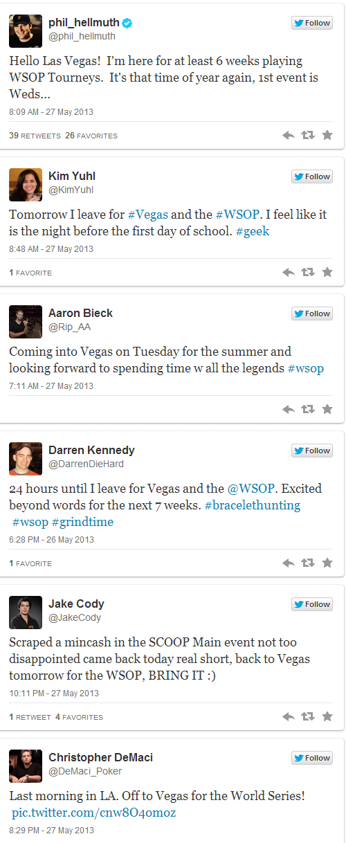 Η δράση ξεκινάει ουσιαστικά αύριο με το $500 No Limit Hold’em Casino Employees κι ένα $5.000 No Limit Hold’em 8-handed και μια πλειάδα επαγγελματιών φρόντισε μέσω Twitter να αναγγείλει τον ερχομό της στην ‘Μέκκα του Τζόγου’.