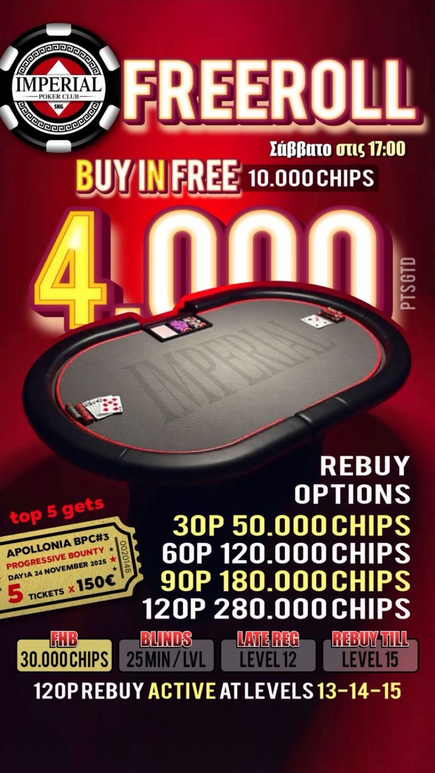 Imperial: Freeroll στις 17:00 με 4.000p gtd