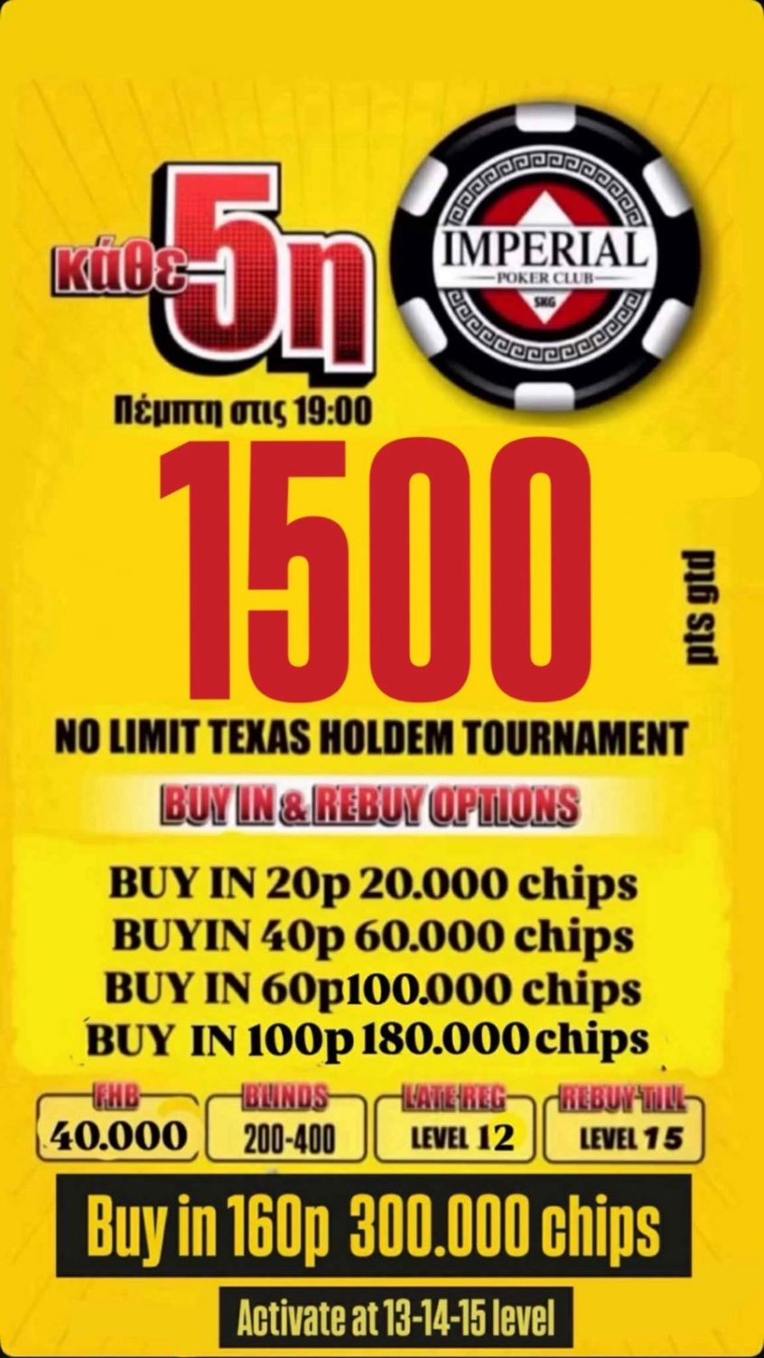 Ιmperial: Τουρνουά στις 19:00 με 1.500p gtd