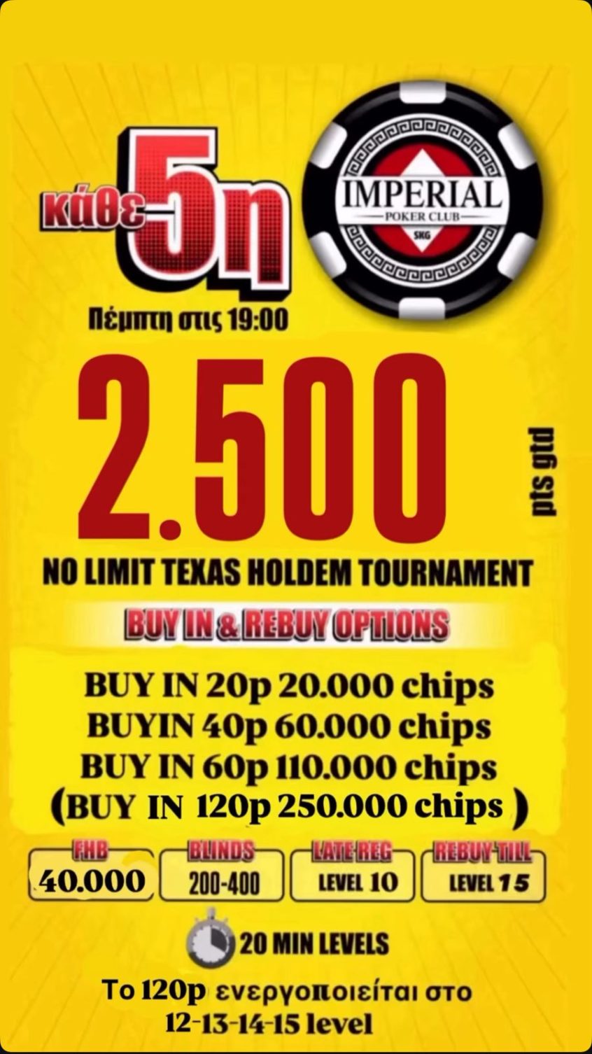 Ιmperial: Τουρνουά στις 19:00 με 2.500p gtd