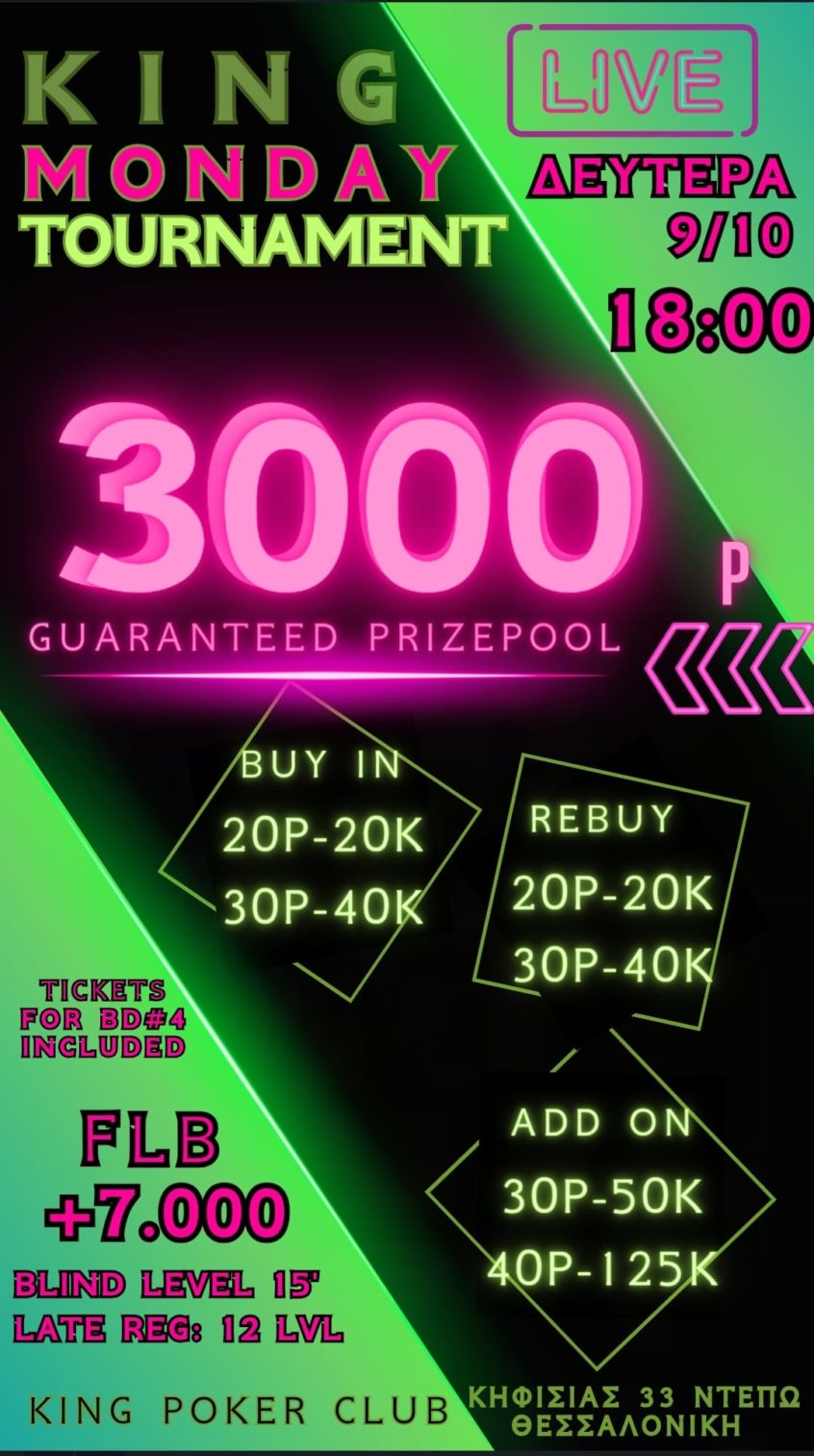 Κing: Στις 18:00 το 20p NLHE με 3.000p gtd + ring games