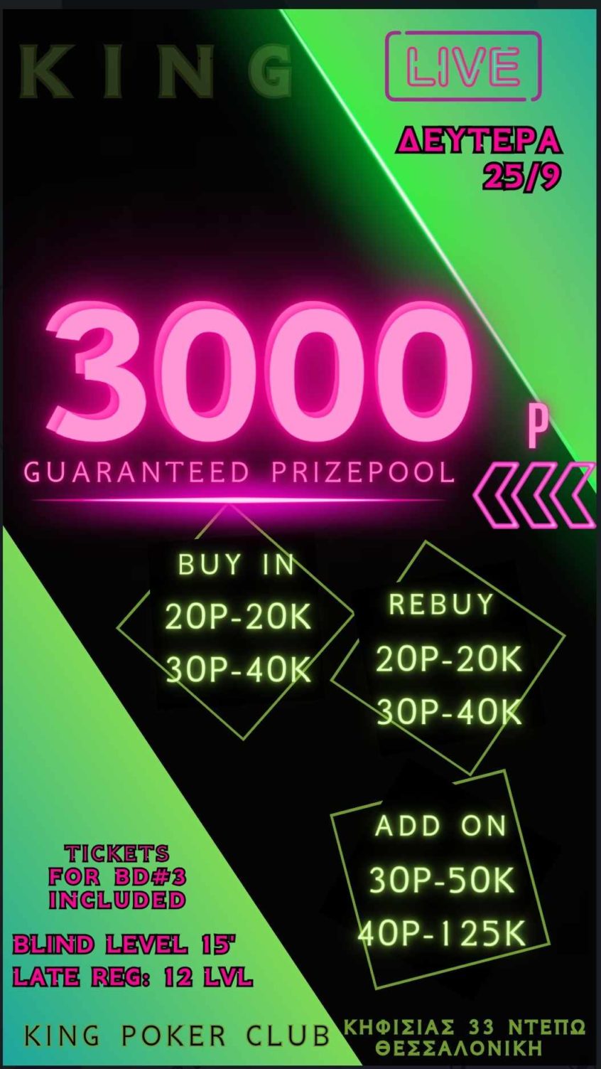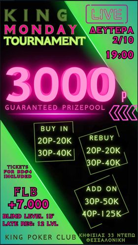 Κing: Στις 19:00 το 20p NLHE με 3.000p gtd