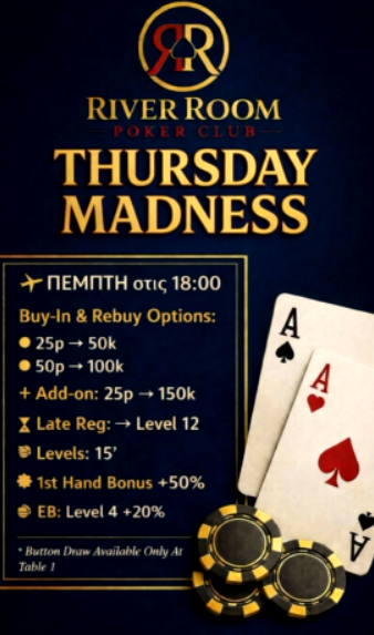 To δημοφιλές Thursday Madness επιστρέφει απόψε στις 18:00 στο River room poker … Read More
