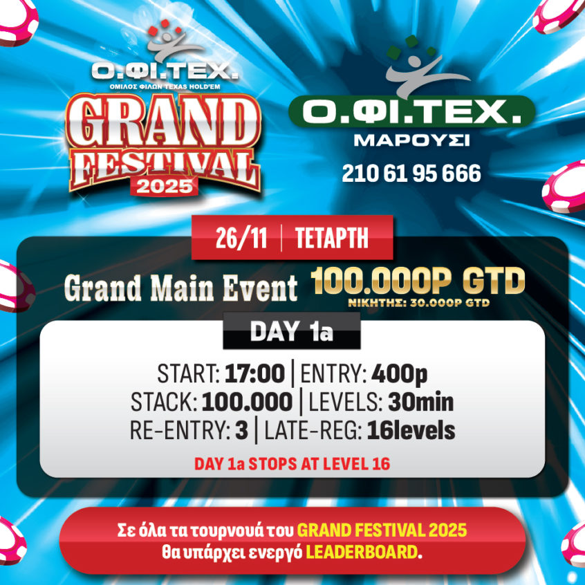 Ο.ΦΙ.ΤΕΧ.: Πρεμιέρα για το Grand main event (100.000p gtd) στο Μαρούσι