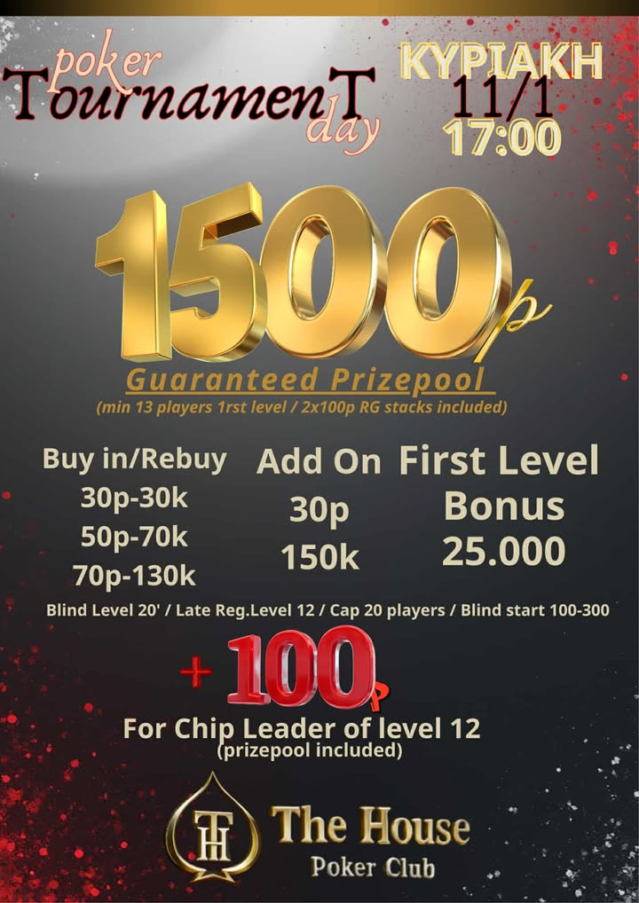 Τhe House Poker Club: Εκτάκτως στις 17:00 τουρνουά με 1.500p gtd + ring games