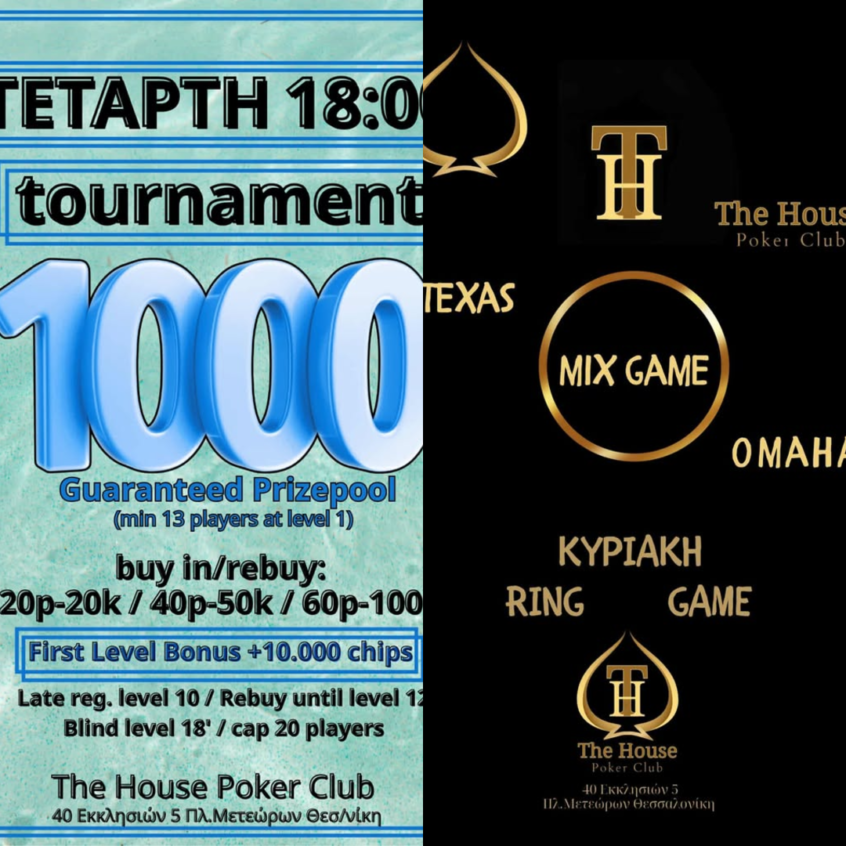 The House Poker Club: Τουρνουά στις 18:00 με 1.000p gtd και mix games