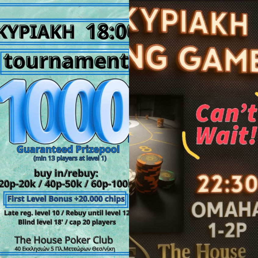 The House Poker Club: Κυριακή με τουρνουά (1.000p gtd) και ring games